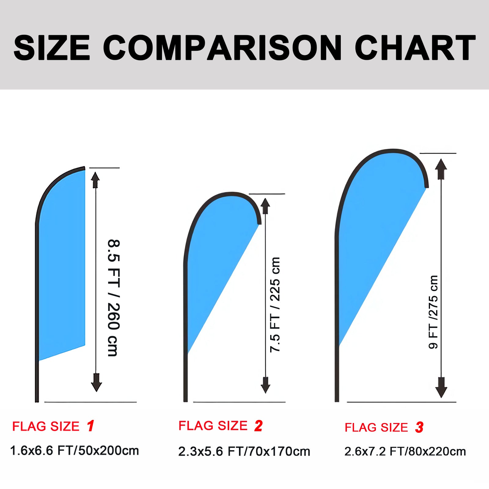 - 2 flag printing options, 3 pole kit sizes are available for you to choose from. Cross base or floor insert, can be selected in the custom page.
