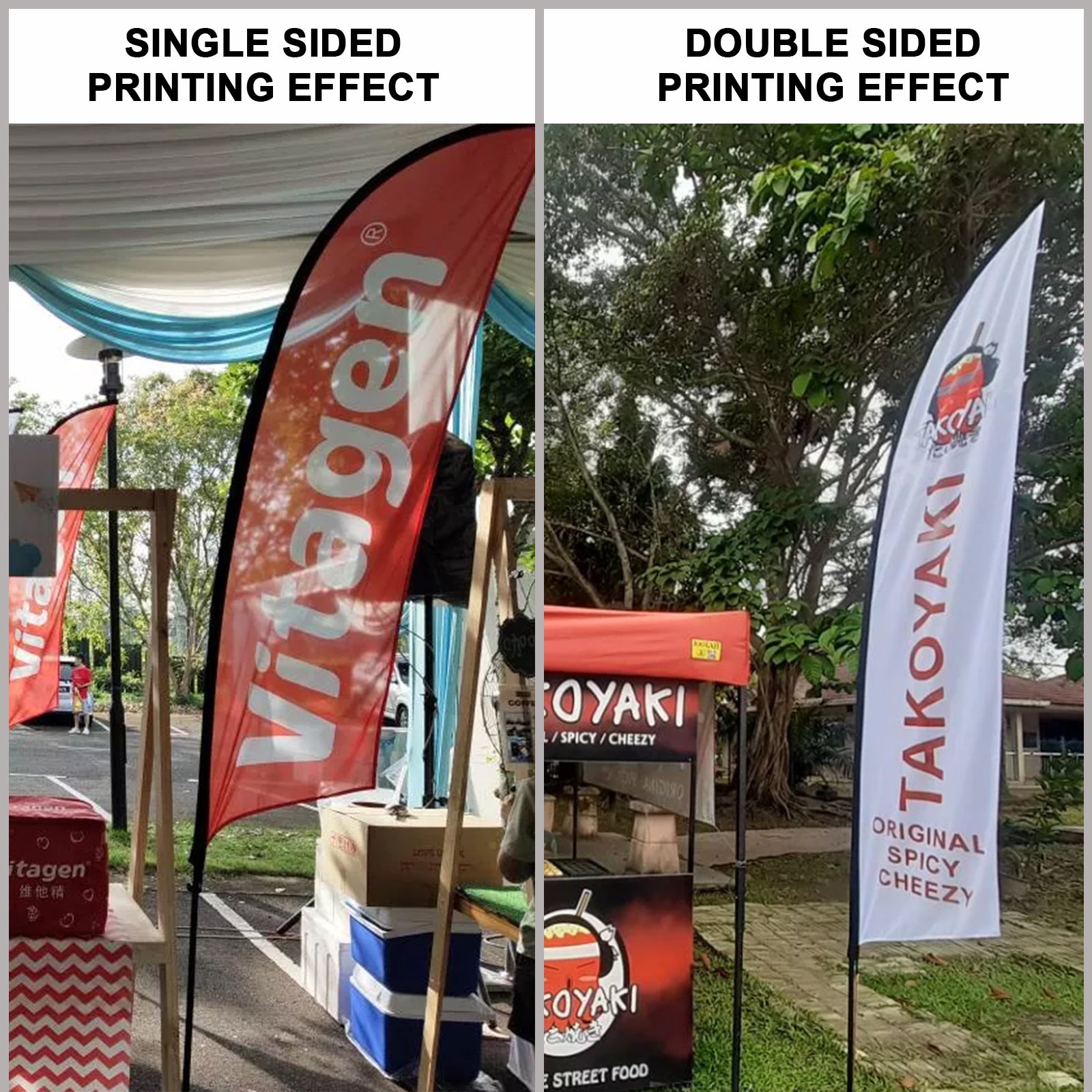 - Advertising flags can be single sided or double sided. The double sided promotional flag has three layers of cloth (two layers of independent design cloth and one layer of blackout cloth).
